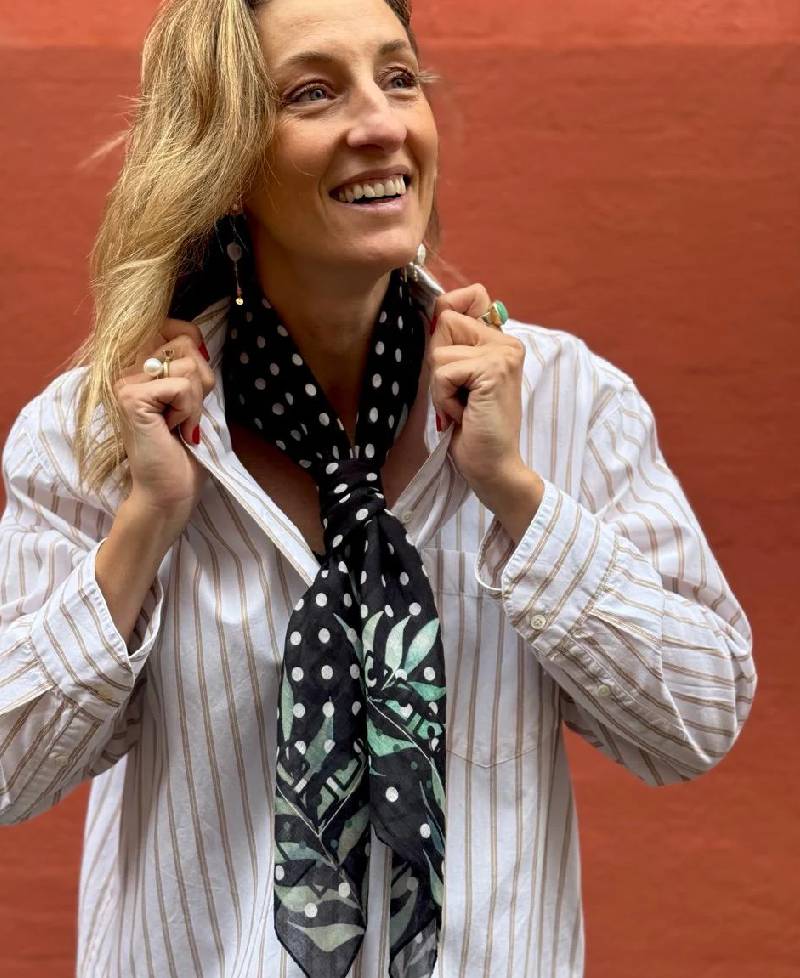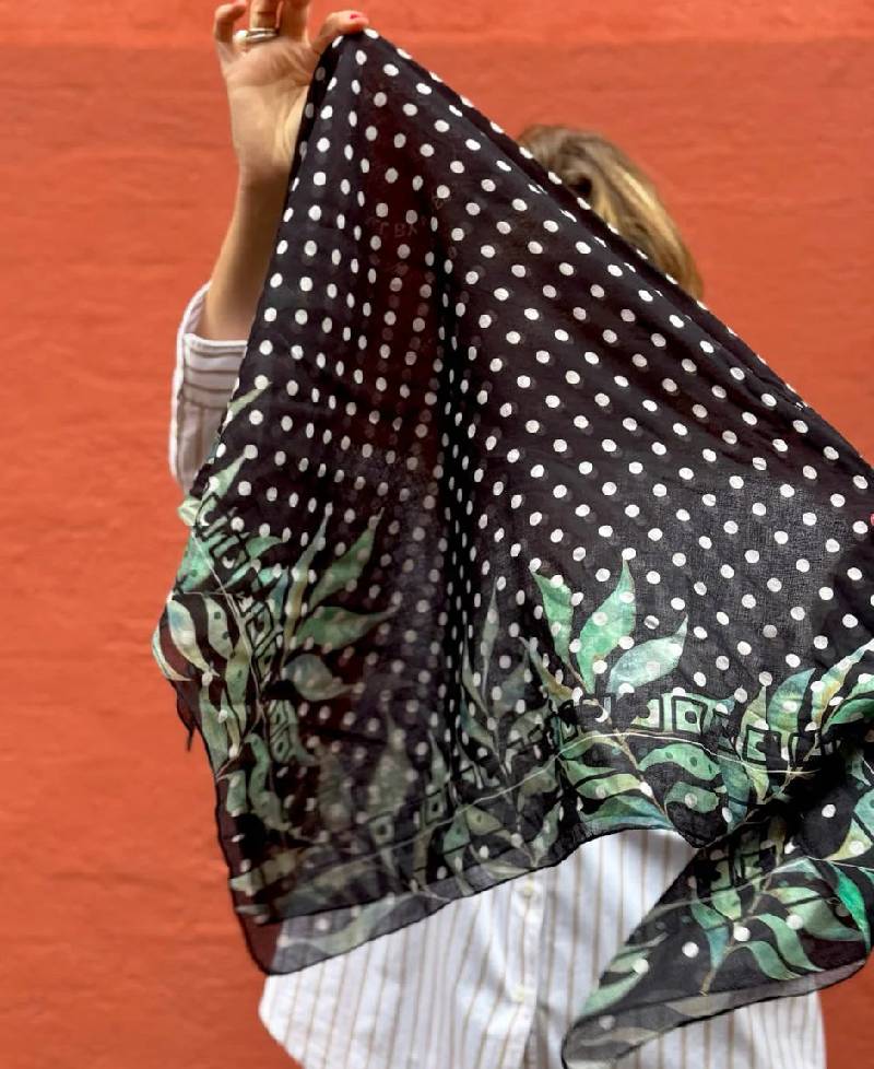 Tørklædet er en smuk komposition af akvareller på sort bund med cremefarvede polkaprikker.