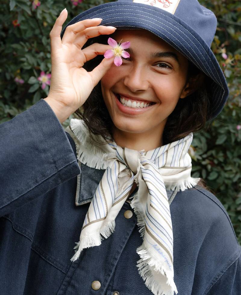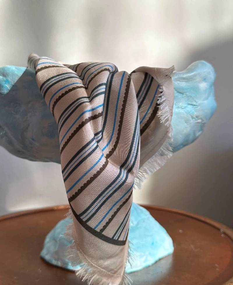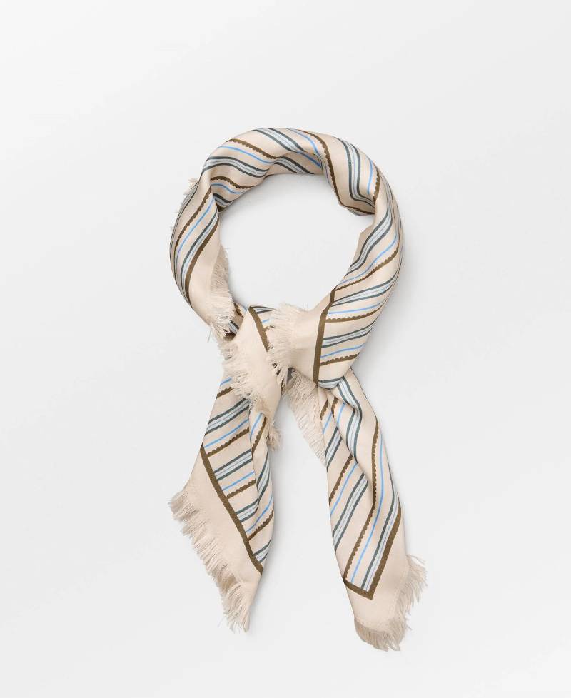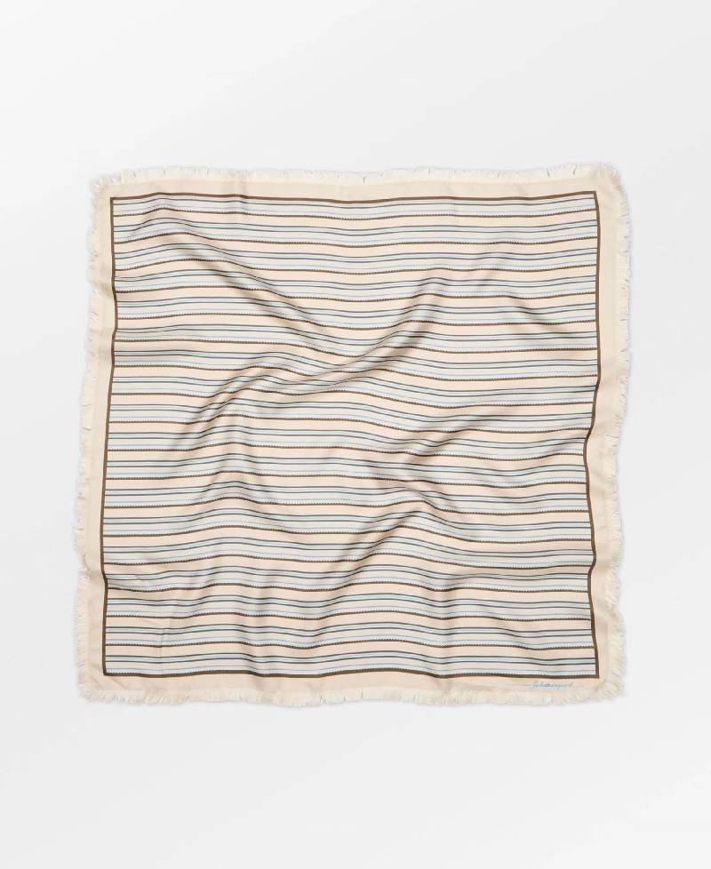 Scallopia Striped Sia Scarf fra Becksöndergaard er et firkantet tørklæde på 65 x 65 cm lavet af 100 % silke. Det stribede mønster giver et rent og klassisk udtryk, mens silken føles let og behagelig mod huden. Brug det om halsen, i håret eller på tasken for et enkelt løft til dit outfit.