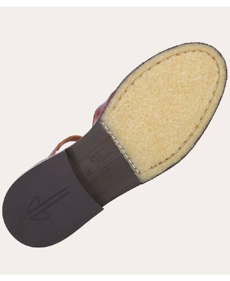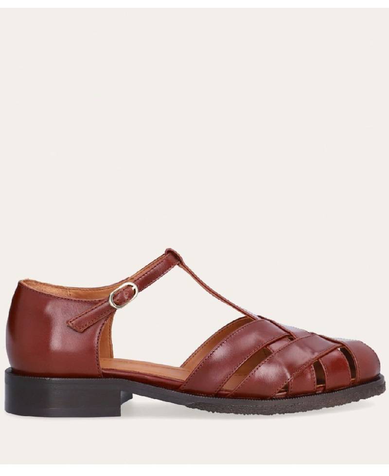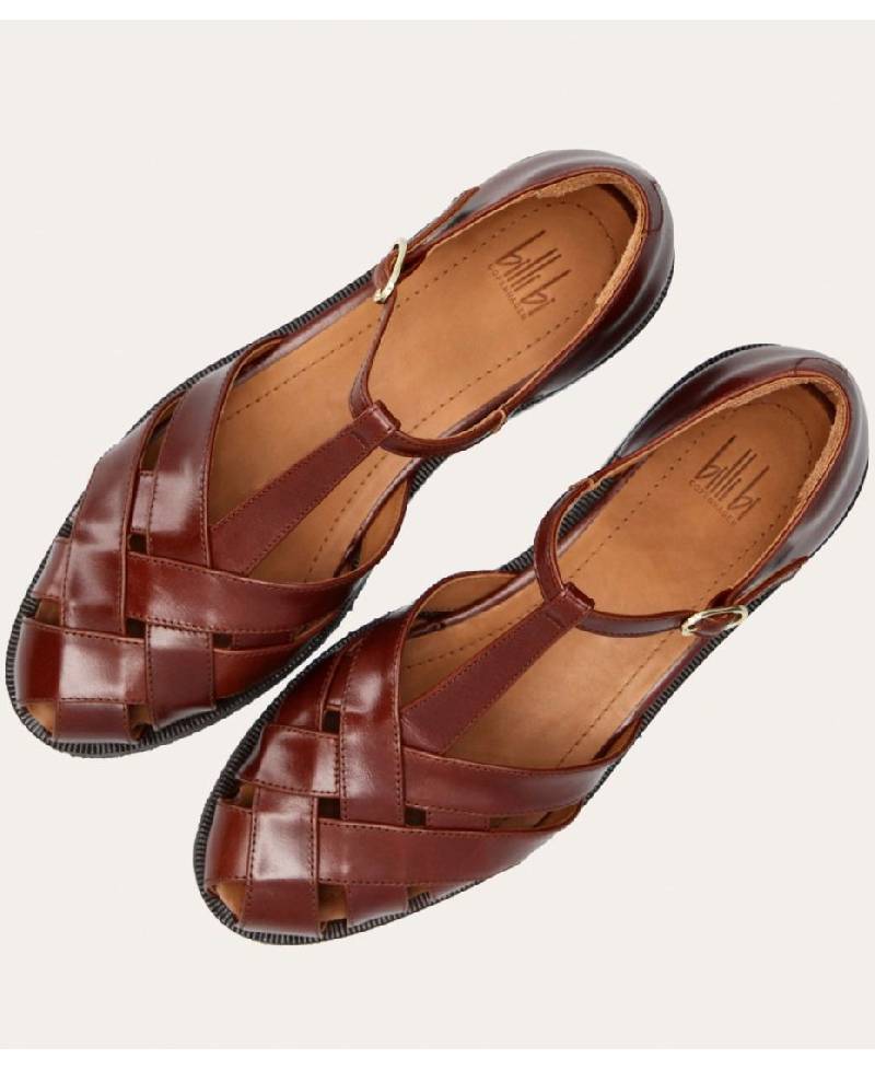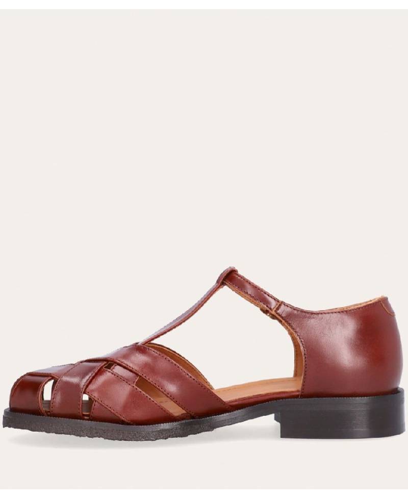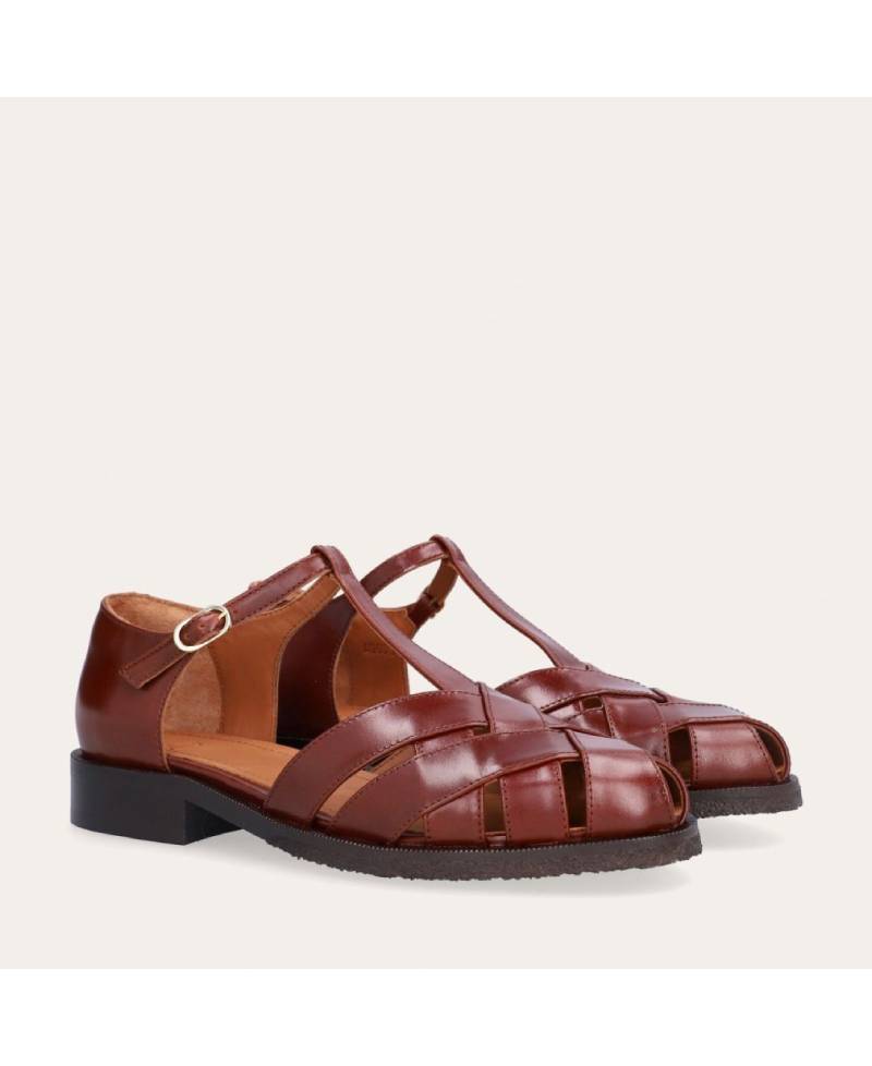 Håndlavet flad fishermen sandal, udført i brunt lakeret skind med rund tå. Sandalens front er konstrueret af stropper i skind, som er vævet ind mellem hinanden. Sandalen lukkes med et lille sølv-farvet spænde. Designet med lukket hælkappe for en raffineret silhuet.