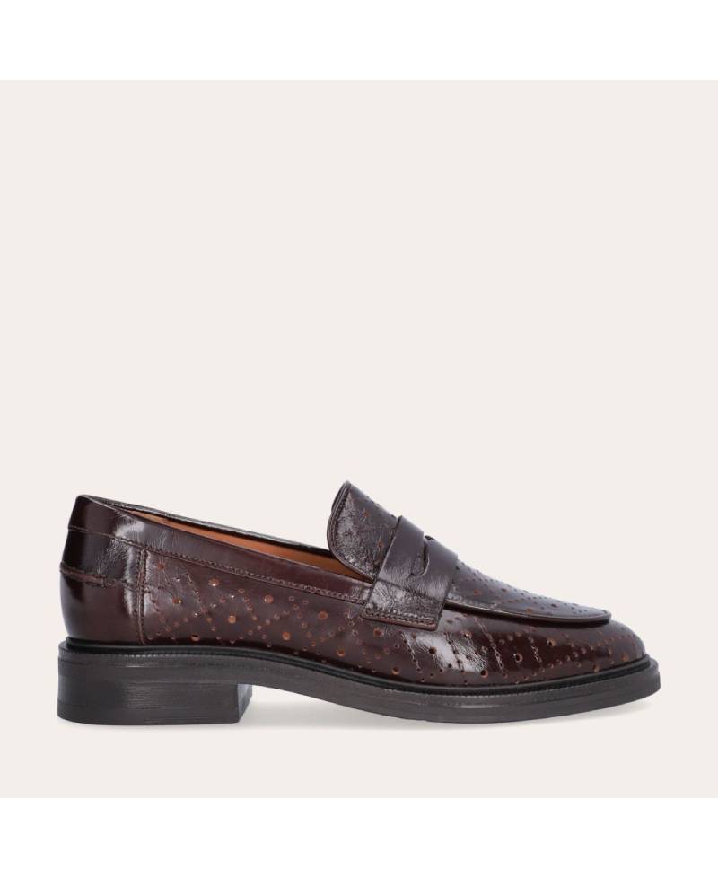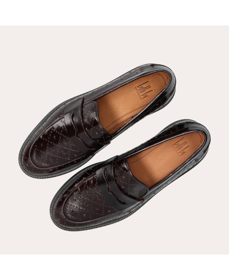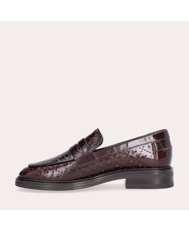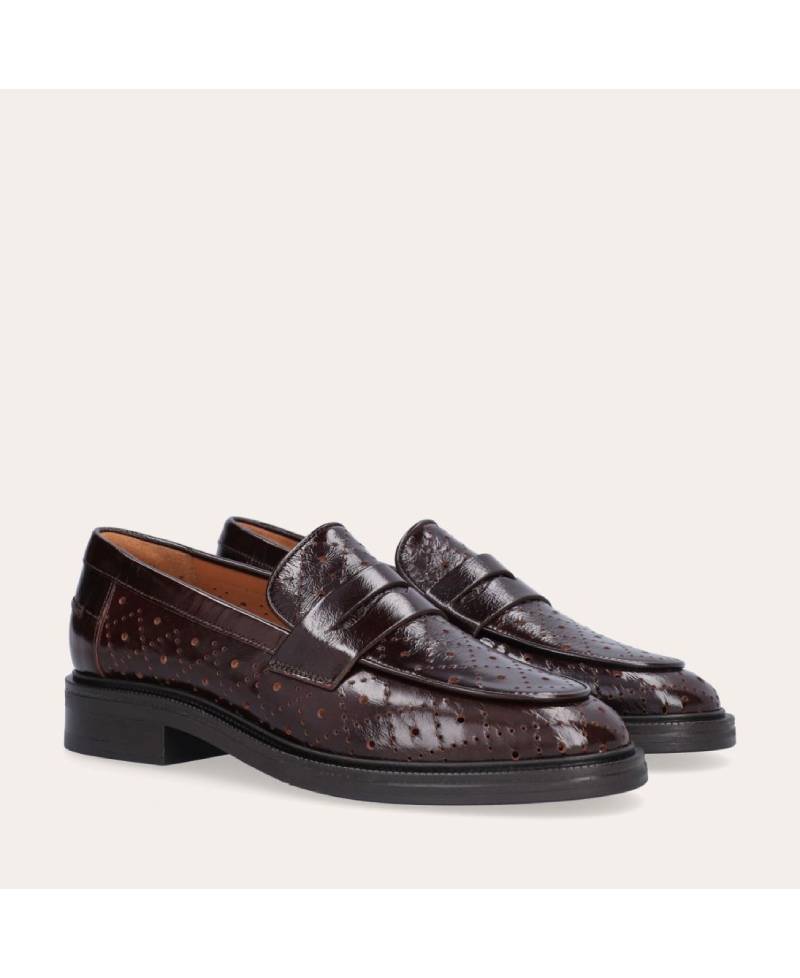 Håndlavet loafer udført i mørkebrunt lakeret skind med et perforeret mønster og en rund tå. Loaferen er dekoreret med et cut-out foran og stikninger på hælen