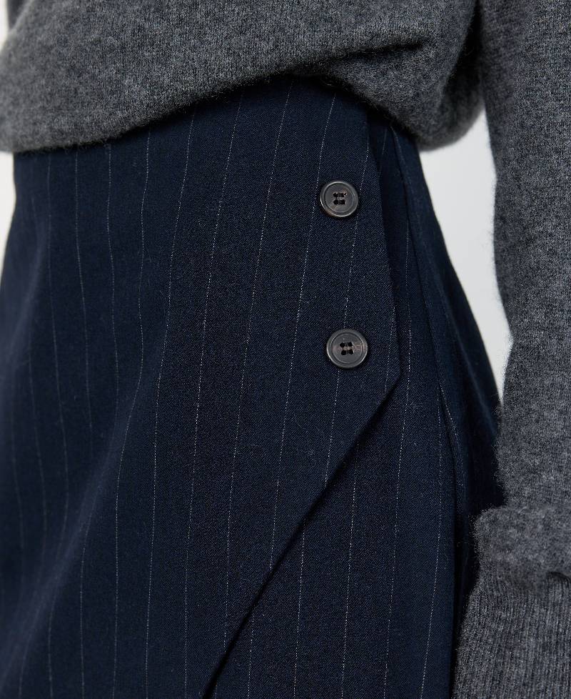 LR-OLIVIA 3 er en nederdel fremstillet af 64 % genbrugspolyester, 34 % viskose og 2 % elastan. Den har et elegant wrap-over-design med nålestribede detaljer og en asymmetrisk kant.