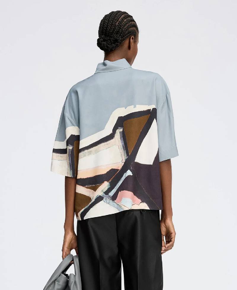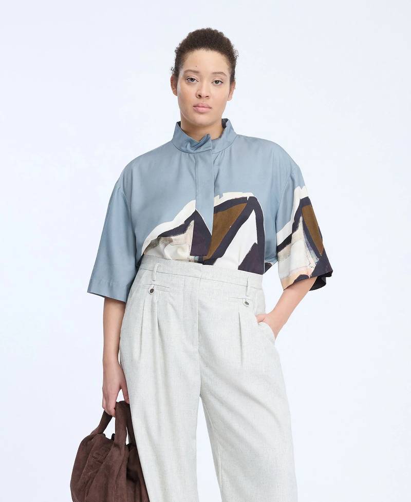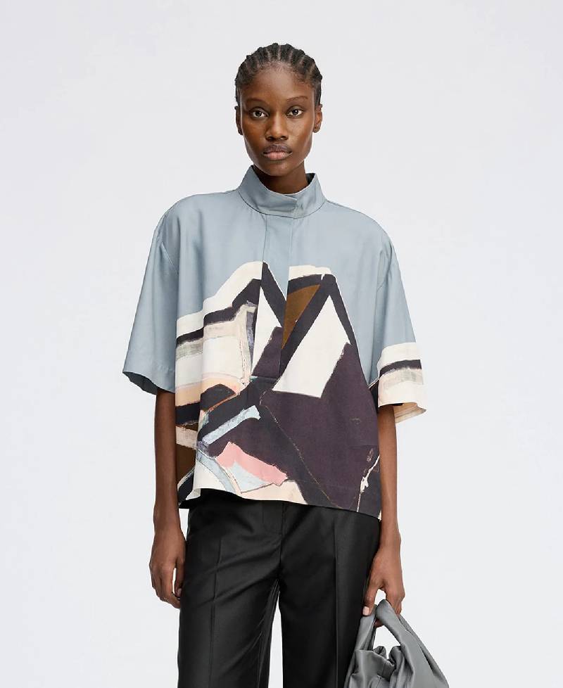 En smuk skjortebluse med et elegant kunstprint. Den er designet med korte ærmer, kan åbnes halvvejs ned og har en lille krave med en fin knaplukningsdetalje. Skjorteblusen har et løst fit.