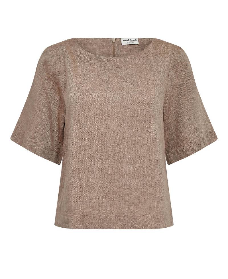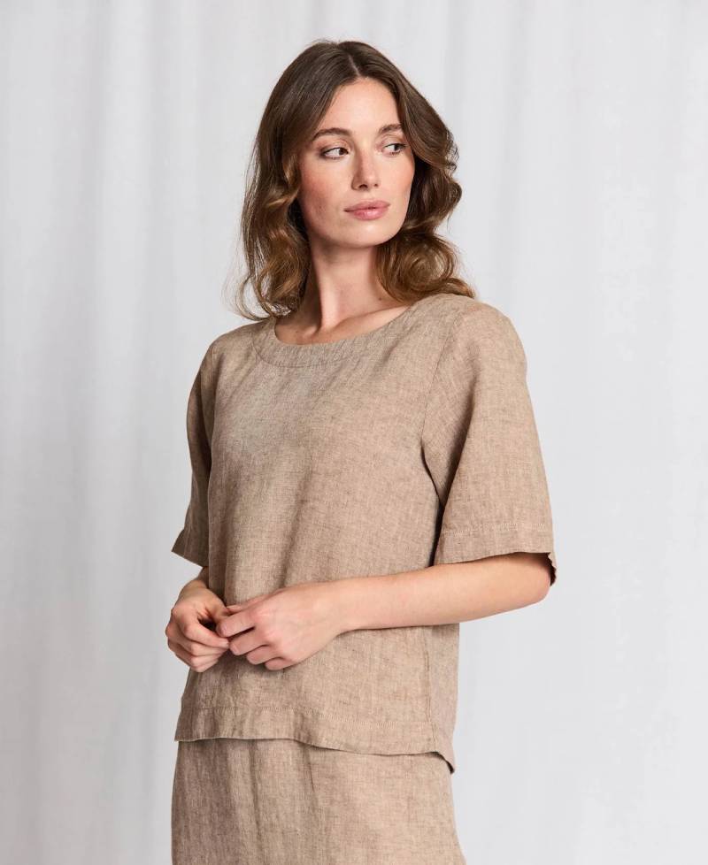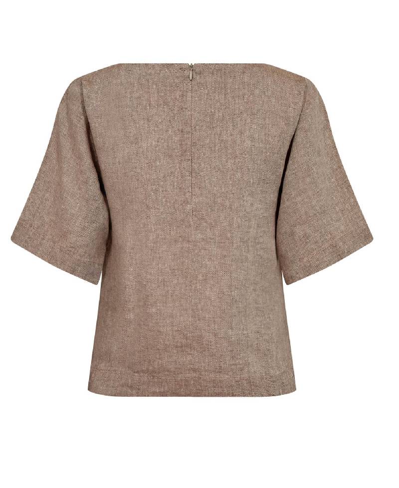 Toppen er fremstillet i 100% hør med en bådformet hals og brede 3/4-ærmer, som giver et let og tidløst udtryk. Den har en skjult lynlås bagpå, der sikrer en diskret lukning og ren finish.