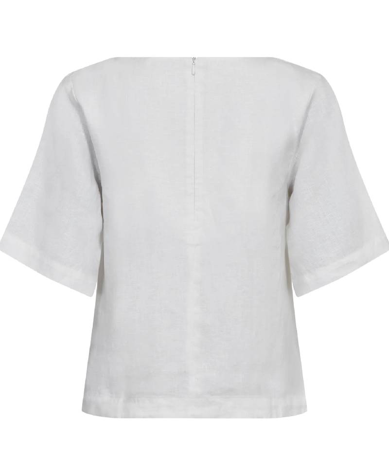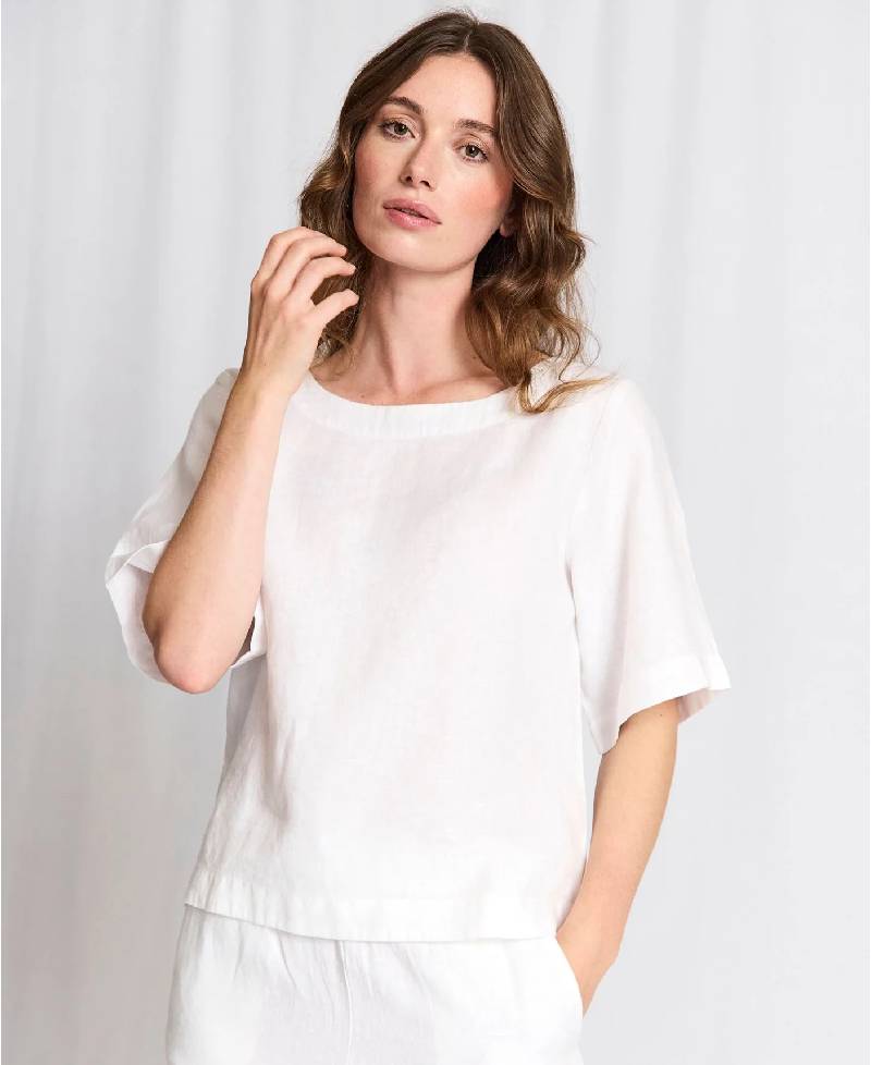 Toppen er fremstillet i 100% hør med en bådformet hals og brede 3/4-ærmer, som giver et let og tidløst udtryk. Den har en skjult lynlås bagpå, der sikrer en diskret lukning og ren finish.