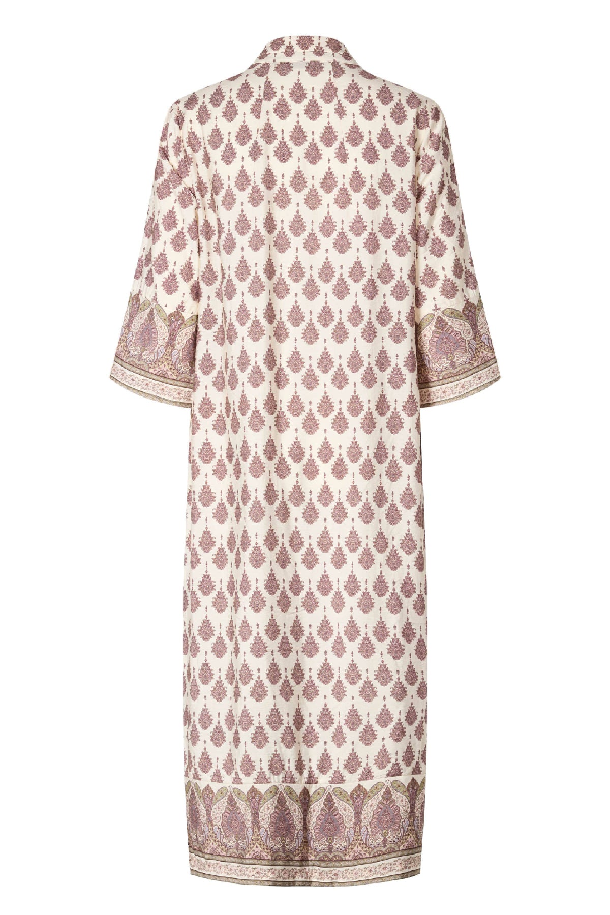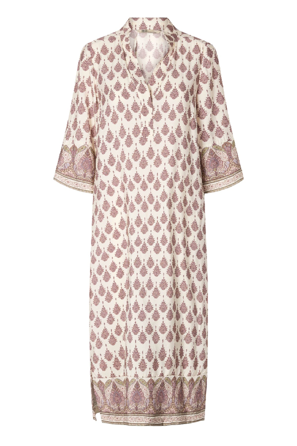 PBOSimbia kjole er en lang model med løs pasform, V-udskæring og korte ærmer, der giver et afslappet og elegant udtryk i det dekorative print.